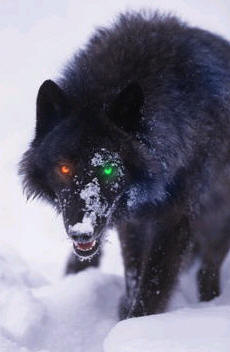 In Crinos/ Hispo/ Lupus: Reines, nachtschwarzes Fell ohne Abzeichen mit leichtem blauviolettem Schimmer, dichter, voller Pelz, im Nacken etwas länger und ausgeprägter.